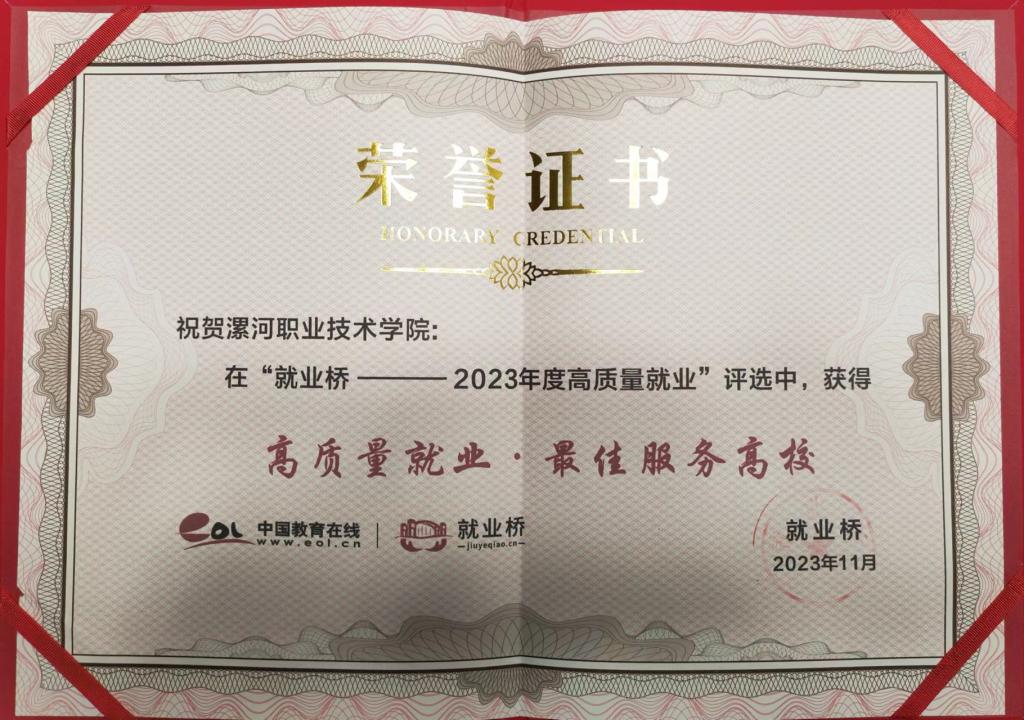 近日,中国教育在线举办“2023年高质量就业”优秀院校评选活动,对就业工作表现突出的高校进行表彰。漯河职业技术学院应邀参选并荣获“2023年度高质量就业·最佳服务高校”荣誉称号。