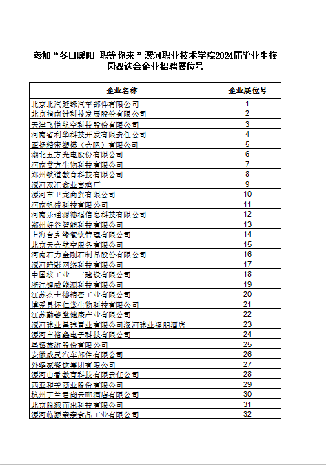感谢贵单位长期以来对我校毕业生就业工作的关心、支持和帮助!根据招聘会企业报名情况,我们对参加“冬日暖阳 职等你来”2024届毕业生校园双选会的报名企业,有关招聘事项、企业资质等进行了严格审核,共有62家企业符合条件。为方便企业了解我校更多双选会信息,请各用人单位参会联系人扫描“漯职院12.22招聘企业群”二维码加群。并按招聘会邀请函上的要求准备参会资料,依据企业招聘展位号对号入座,按时参会。