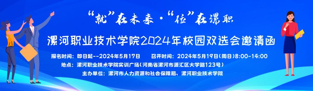 为深入落实国家、省市关于做好2024届高校毕业生就业工作的通知要求,充分发挥校园招聘主渠道作用,漯河市人力资源和社会保障局、漯河职业技术学院联合举办“就”在未来.位”在漯职 2024年校园双选会,诚邀社会各企事业用人单位莅校选才!同时,在国聘平台(24365)、我校就业创业服务网-智慧就业平台(工作啦)和漯职院就业桥举办线上双选会。我们将尽全力推荐贵单位所需人才,竭诚为您服务。