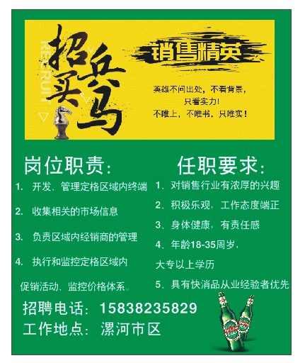 漯河市丙戌商贸有限公司是漯河市区青岛啤酒的主要供应商,是本地快消品行业供应商的佼佼者。本次招聘为厂家直招,应聘成功后即到青岛啤酒漯河办事处工作,专业不限,转正后待遇丰厚,享受六险一金的福利。