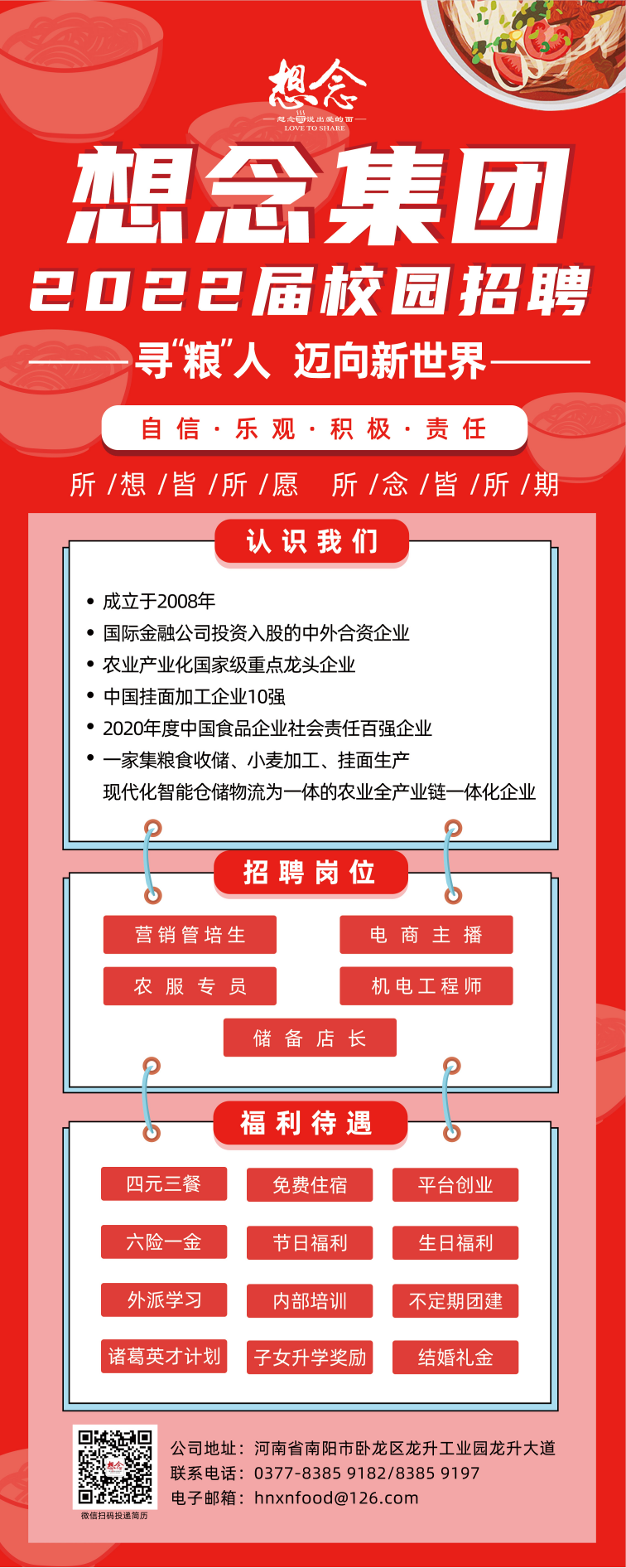 “想念集团”,这艘崛起于千里沃野的面业旗舰,将盛载中原大地深厚的人文底蕴和永不停歇的进取精神,驶向更加辉煌灿烂的明天!现诚聘以下英才: