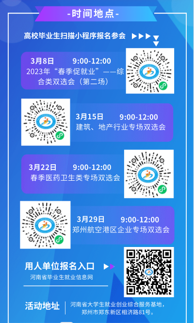 为积极拓宽毕业生和用人单位沟通渠道,搭建供需交流平台,推动高校毕业生更高质量和更加充分就业。河南省2023届高校毕业生“百万岗位护航计划”3月双选会具体安排:(一)3月8日(周三)“春季促就业“综合类第二场双选会;(二)3月15日(周三)建筑、地产行业专场双选会;(三)3月22日(周三)春季医药卫生类专场双选会;(四)3月29日(周三)郑州航空港区企业专场双选会。欢迎应往届高校毕业生参会,诚挚鼓励我校2023届毕业生和2022届未就业毕业生参加!具体事宜如下:
