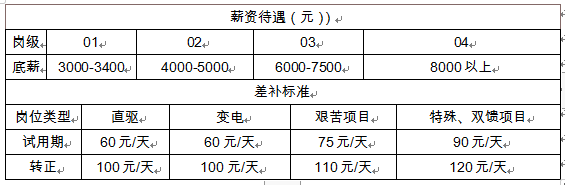 1、薪酬及食宿:无责底薪3000-3400(根据面试结果而定)+差补,试用期薪资5000+,转正后薪资7000+,试用期过后自动转正,第一年综合薪资8w左右,每年都有岗级考核加薪,项目部提供免费住宿,项目部聘请厨师负责饮食。